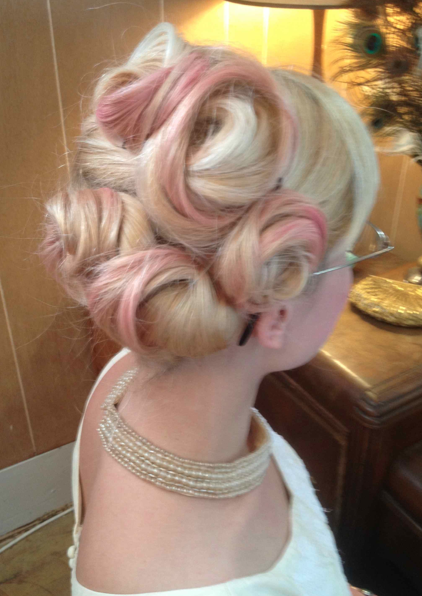Here are a couple of fun chalk hairstyles that I came up with….The first is a chalked and loosely braided and pinned half-up flower that is just so sweet. I want to do a whole bouquet next time.